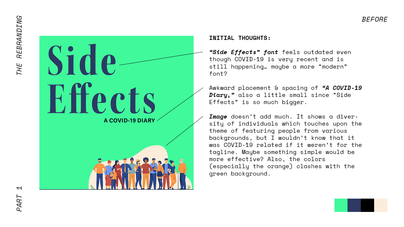 Side Effects captures a wide array of experiences and weaves them together under the backdrop of the coronavirus. We talk to guests as they encounter unforeseen consequences, find solace in their loved ones, and readjust their plans over and over again. Journalistic in nature, the podcast had artwork that includes sleek, curvy lines and a sans serif font to upkeep a style that is contemporary and legible. The introduction of hand-drawn images, media screenshots, and pullout quotes creates context and personalizes each story line while creating an overarching holistic and consistent feel.